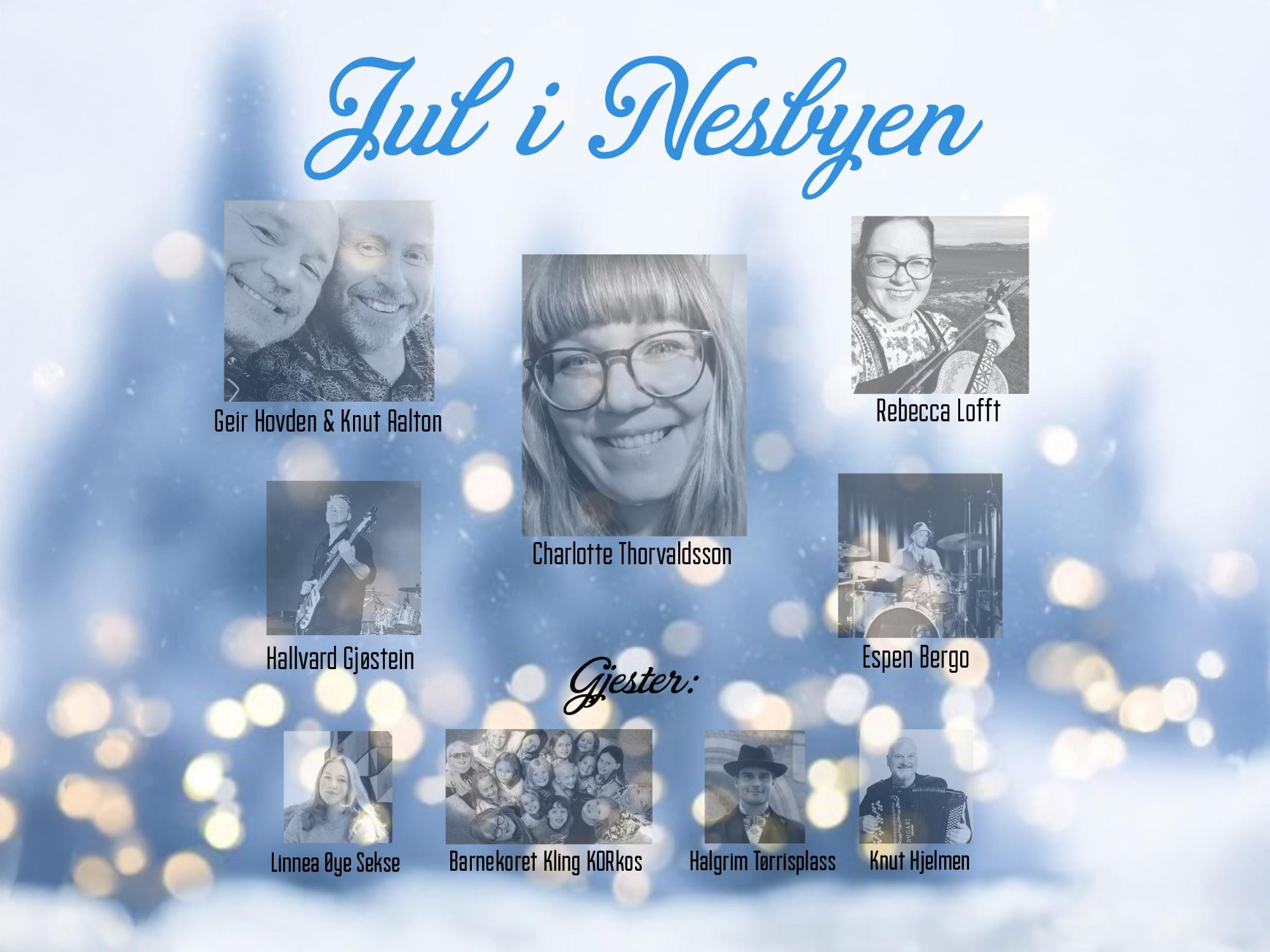 Jul i Nesbyen består av Charlotte Thorvaldsson, Knut Aalton, Geir Hovden, Hallvard Gjøstein, Rebecca Lofft og Espen Bergo.